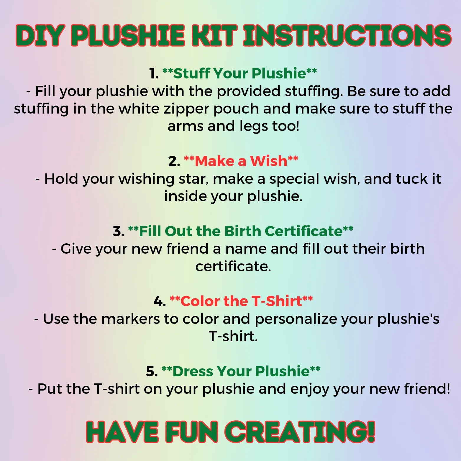 • 5, 10, or 15 plushies (based on kit size)
